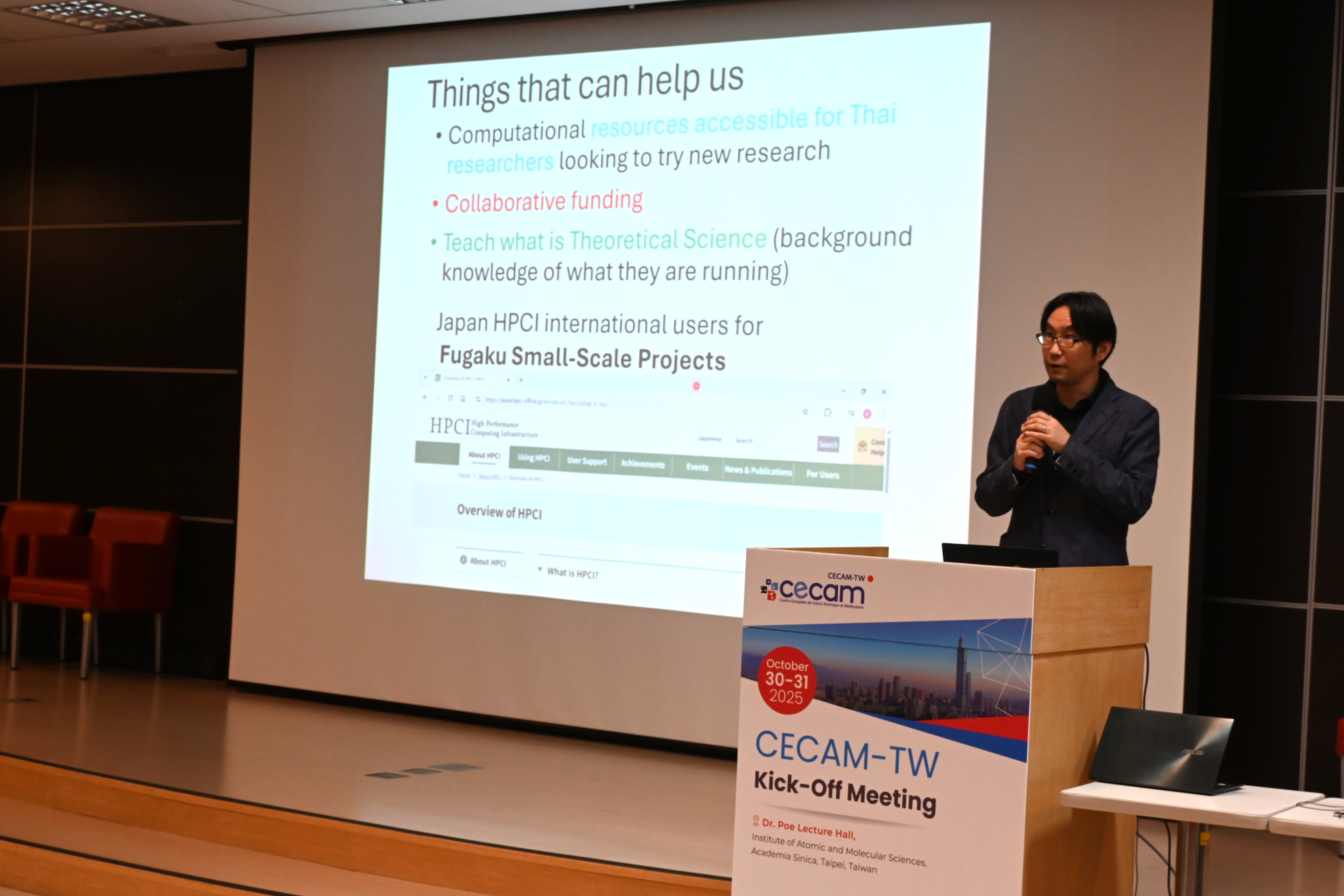 The CECAM-TW Kick-Off Meeting marked the official launch of the Taiwan Node of the Centre Européen de Calcul Atomique et Moléculaire (CECAM). The event brought together members of the CECAM community, academic colleagues from across Asia (including Japan, Korea, Thailand, the Philippines, Vietnam, India, and others), as well as researchers from the broader academic community in Taiwan. Representatives from different regions presented overviews of local research activities and developments. Through this kick-off meeting, we fostered academic exchange and opened a new chapter for the development of CECAM in East Asia.